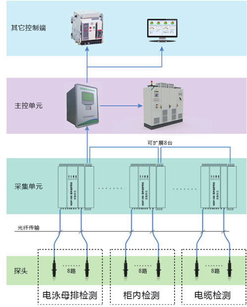 一個主控單元能同時保護幾個檢測區(qū)域,因此弧光微機監(jiān)控系統(tǒng)的采集單元可以分散到不同的位置,把檢測到的弧光信號傳送到主控單元。
